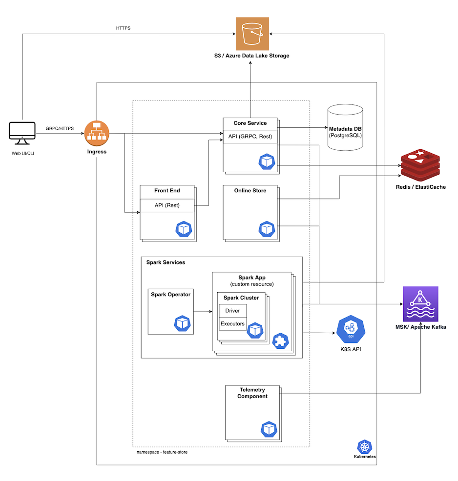 Feature Store itself requires four components to be up and running inside a Kubernetes cluster. These main services will be installed automatically when you use our Helm charts.