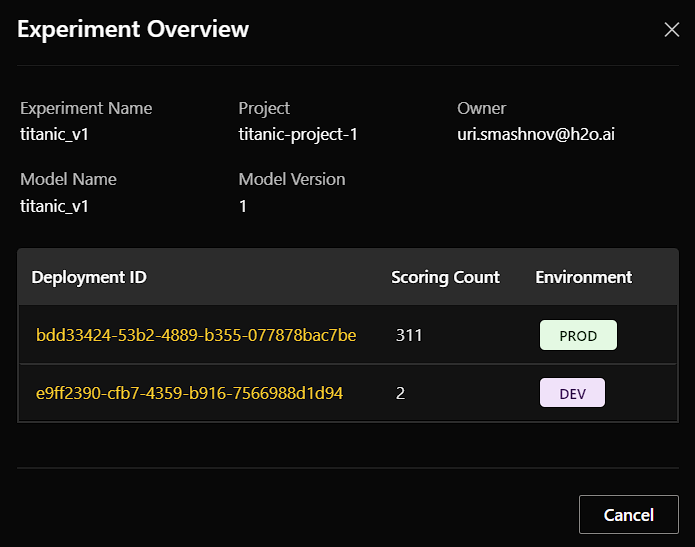 For models that have been deployed, you can view historical scoring data from the Experiment Overview window by clicking a deployment's Deployment ID.
