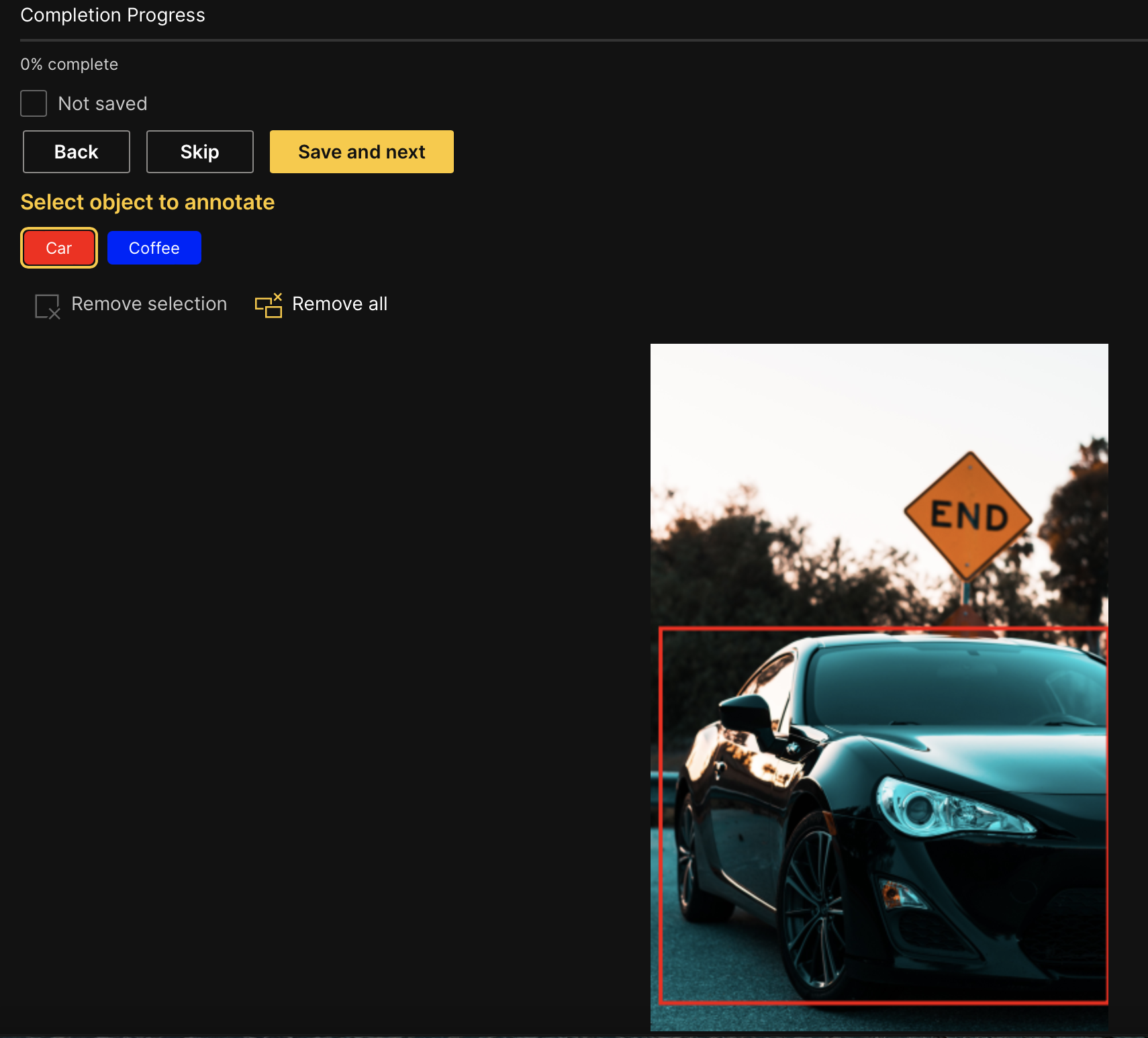As you annotate the dataset, you can select which label (object class) to use depending on whether the image depicts a car or coffee. To select the Coffee or Car object class: Click Car or Coffee.