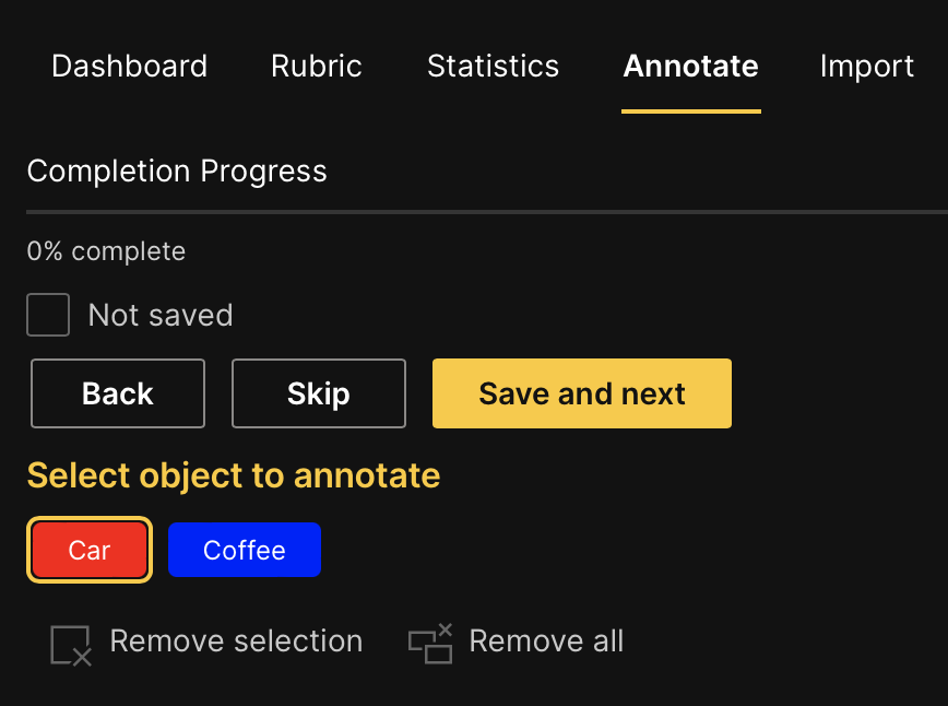 Before we can start annotating our dataset, we need to specify an annotation task rubric. An annotation task rubric refers to the labels (e.g., object classes) you want to use when annotating your dataset. For our dataset, there are two labels (object classes) we want to specify, car and coffee. Let's define the annotation task rubric.