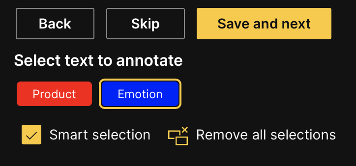 NoteAs you annotate the dataset, note that you can select which entity to use as you annotate a review. To select the Product or Emotion entity: Click Product or Emotion.